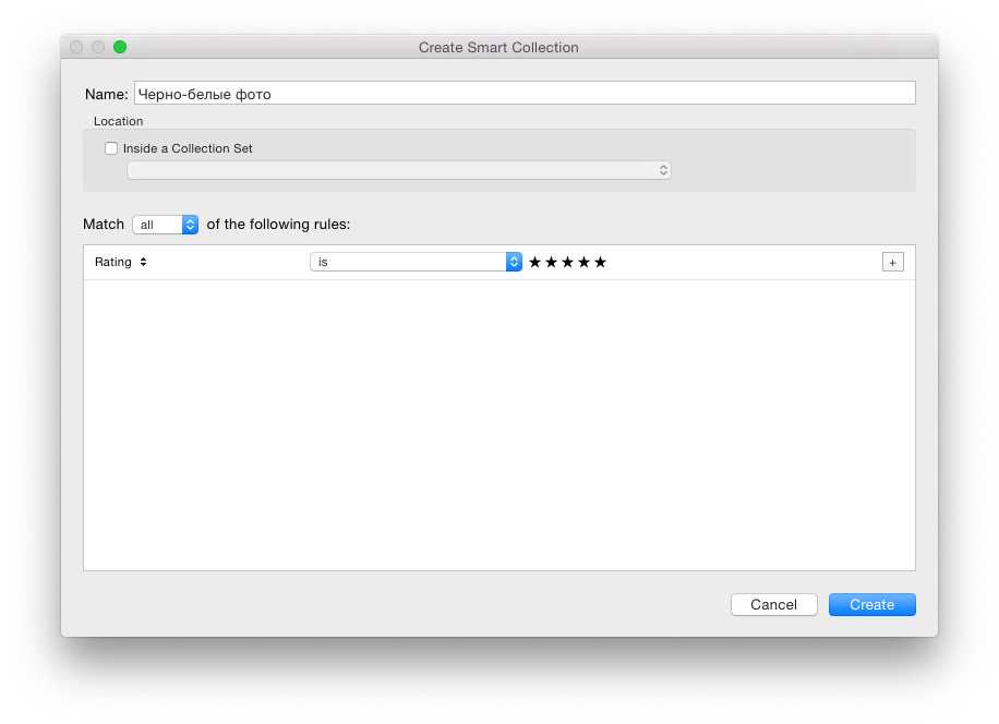 Во время пакетной обработки у нас нет возможности отвлекться надолго на отдельные кадры, но мы можем отметить их и объединить в группы для того, чтобы заняться ими позже и так же обработать пакетно. Первый способ собрать все отмеченные фотографии вместе – это во вкладке library сортировать файлы по выбранному вами признаку и создать обычную коллекцию. Второй способ – заранее создать и настроить Smart Collection. Например, создадим коллекцию по признаку пять звезд и назовем её «Черно-белые фото».