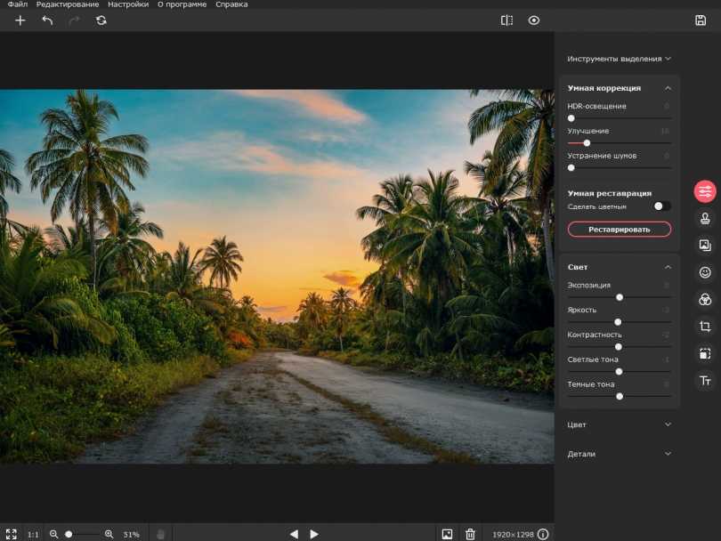 - Инструменты обработки, обученные нейросетями: HDR-освещение, реставрация фото, устранение шумов