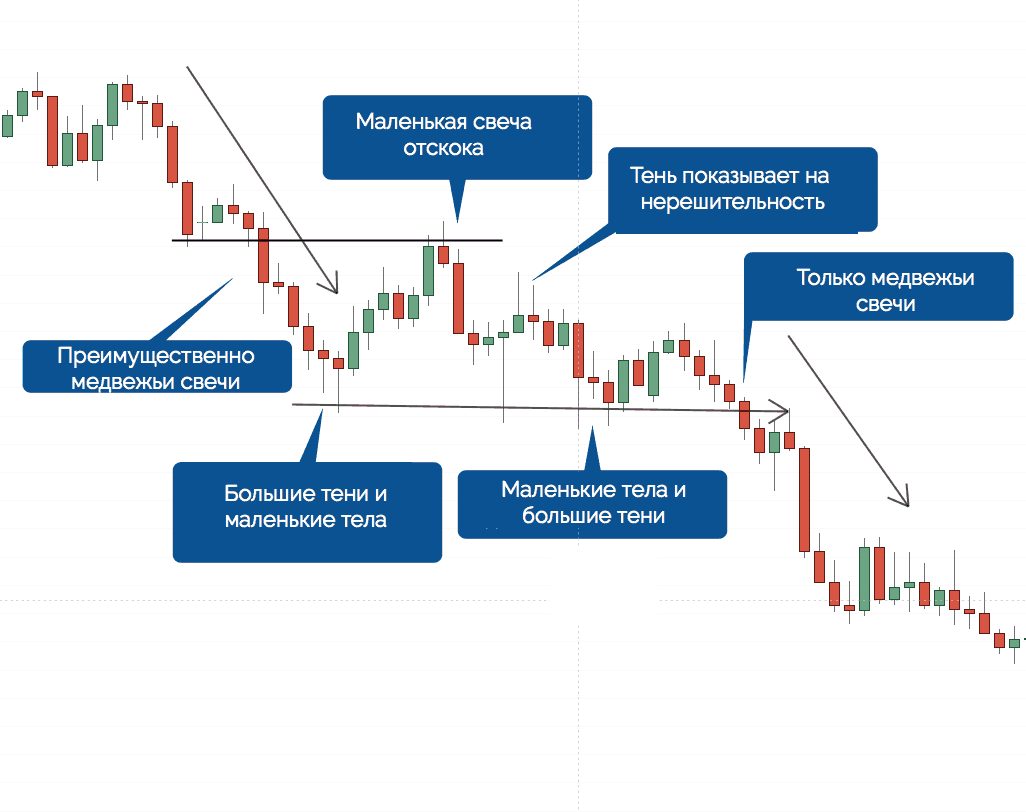 - Во время нисходящего тренда свечи только медвежьи и длинные с очень маленькими тенями или вообще без теней — это указывает на силу продавцов.