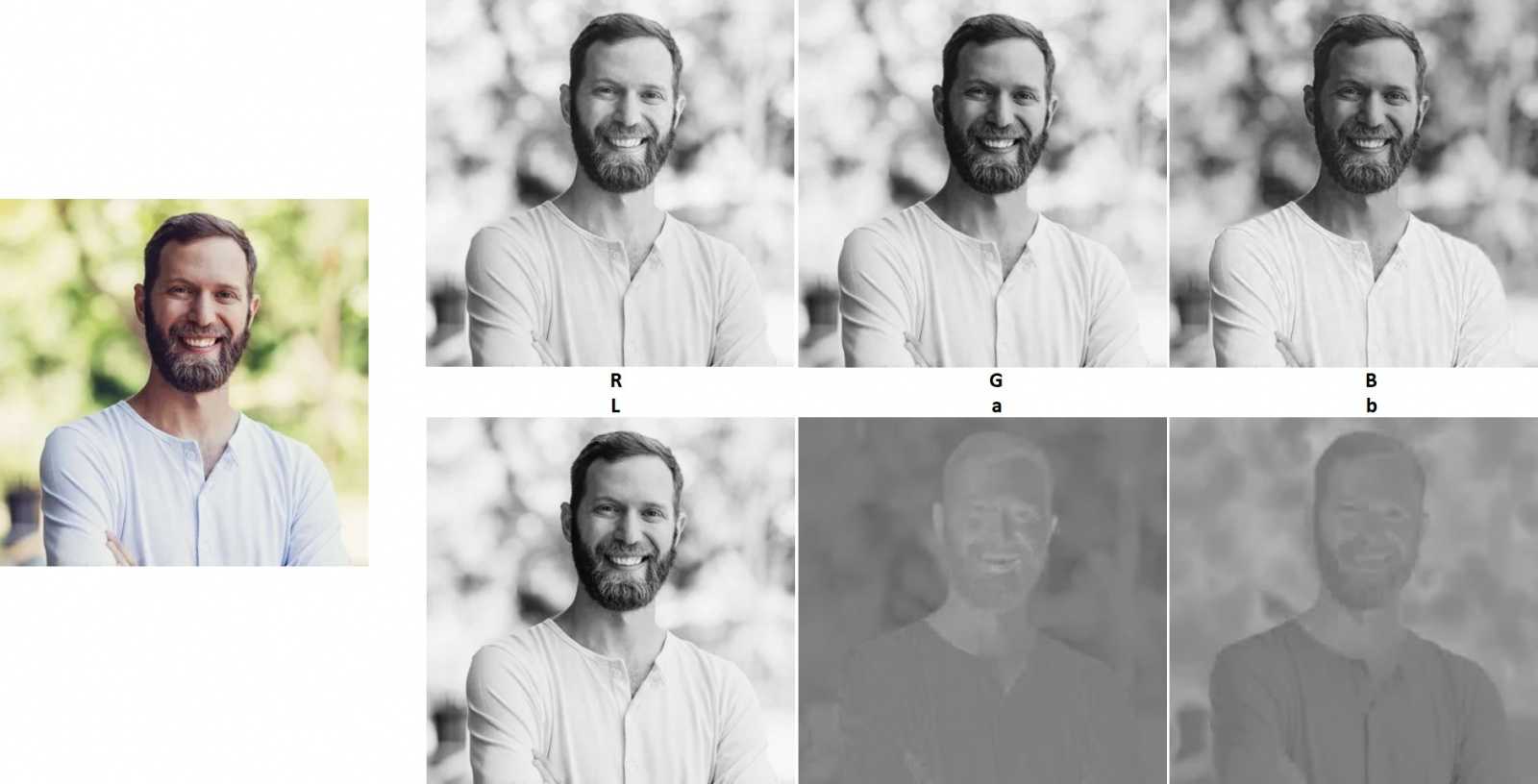 Основной подход по сути прост. Первым шагом мы переводим изображение в формат Lab, который содержит раздельно яркостную (L) и цветовую (аb) составляющие. L-канал это фактически и есть искомое черно-белое фото.