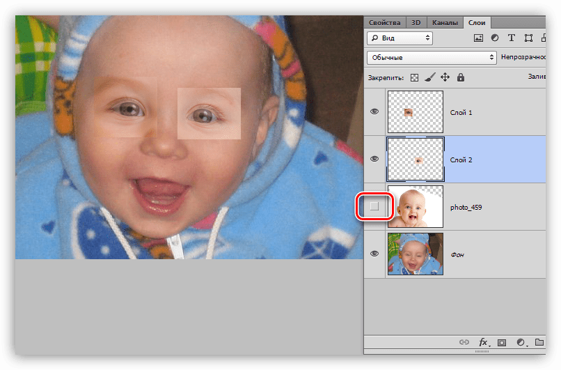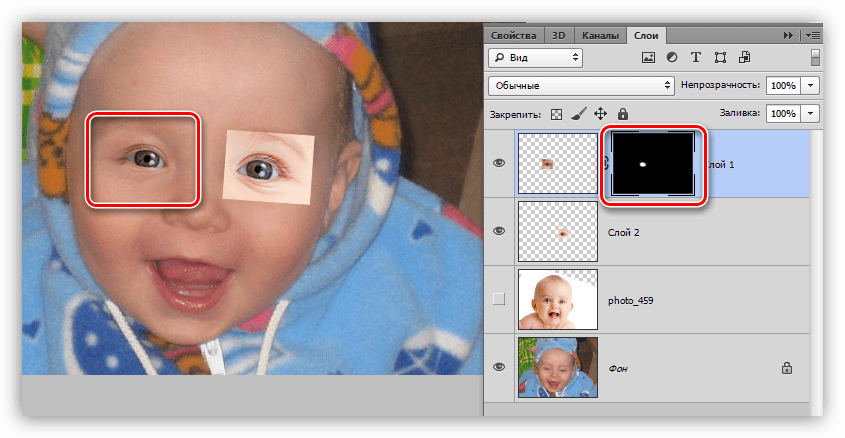 Основная работа выполнена, осталось лишь оставить на изображении только те зоны, на которых расположены непосредственно глаза ребенка. Сделаем это, используя маски.
