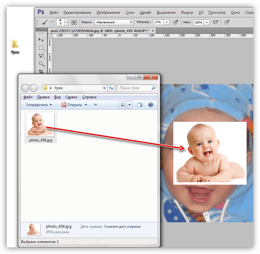 - Помещаем второй снимок на холст. Сделать это можно, просто перетащив его на рабочую область Фотошопа.