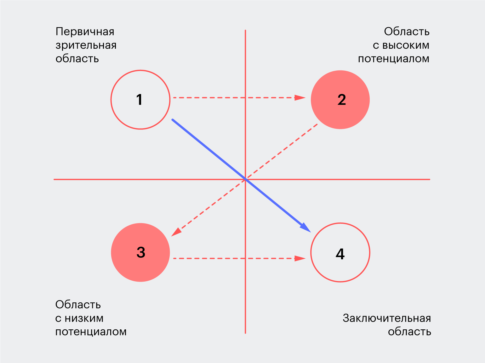 Правый нижний угол — заключительная область. Здесь взгляд останавливается. Эту область часто используют для CTA — призыва к действию, например, для размещения кнопки чата с оператором или регистрации на сайте.