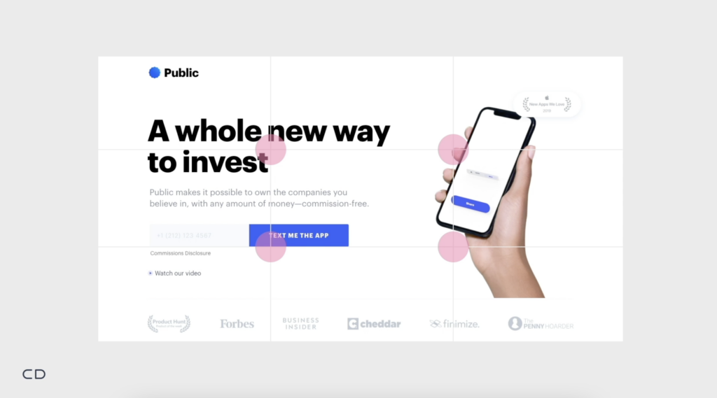 Но так не всегда должно быть, особенно если это противоречит дизайн-концепции или здравому смыслу. В другом примере видно, что кнопка смещена влево, так как все объекты выровнены по левой стороне. Поставить ее на точку пересечения было бы странно, так как тогда она окажется где-то посередине текста.