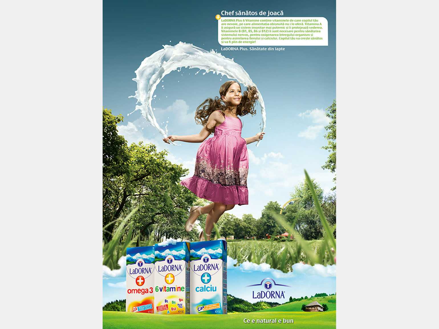 Рекламный постер молока LaDorna. Здесь три композиционных центра. Первый: лицо девочки и скакалка из молока над ним; второй — пакеты с молоком внизу, они выделяются светлым и контрастным пятном; третий — в правом верхнем углу с описанием продуктаИзображение: LaDorna / Corina Bacanu / Behance