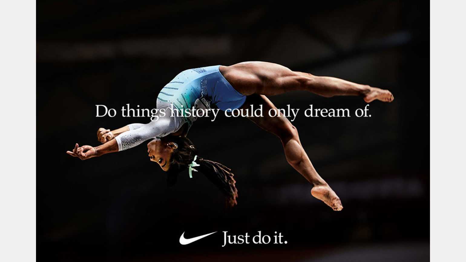 Рекламный плакат Nike. Фигура девушки и надпись вытянуты по горизонтальной оси и расположены практически по центруИзображение: Nike / дизайн компании Wieden Kennedy