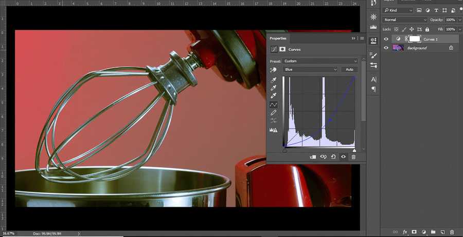 Допустим, у вас есть снимок, который кажется слишком синим (как тот, что приведен выше) даже после коррекции уровней. Вы просто добавляете корректирующий слой Кривые, выбираете Синий канал и перетягиваете точку вниз (для этого также можно использовать стрелочку на клавиатуре). Это сокращает количество синего на снимке, благодаря чему проявляется больше желтого. Далее вы можете продолжить корректировать снимок, то есть, если после этого он приобрел слишком пурпурный оттенок, можете переключится на Зеленый канал и подтянуть кривую немного выше, заглушив пурпурный зеленым