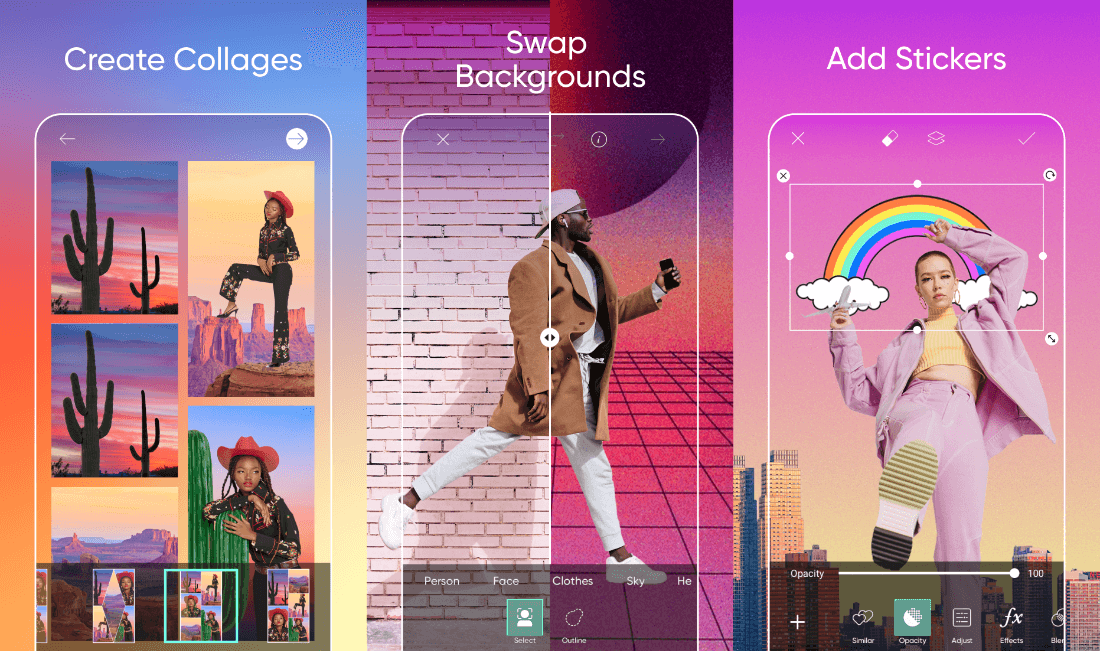 PicsArt предлагает целый набор инструментов для ретуши, доступных как в ручном, так и в автоматическом режиме. Например, приложение может уменьшить ваш живот или любую другую часть тела. Это бесплатное приложение также пригодится, если необходимо удалить с фотографии нежелательные объекты – благодаря PicsArt вы легко избавитесь от любых отвлекающих моментов в кадре.