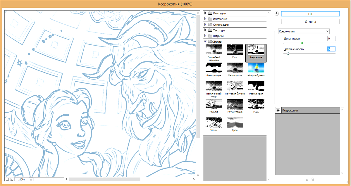 3. Теперь так же откройте меню «Фильтр» и перейдите в «Эскиз» – «Ксерокопия». Откроется окно, в правой части которого необходимо выставить следующие параметры: «Детализация» – 9; «Затемненность» – 5. Нажмите кнопку ОК. На заметку: в этом пункте необязательно строго следовать инструкции. Поэкспериментируйте с показателями детализации и затемненности, чтобы добиться наиболее подходящего для вас результата.