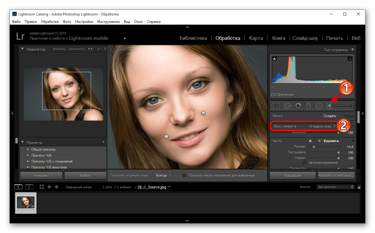 Теперь приступим к самой ретуши. Для этого можно использовать кисть «Сглаживание кожи»
