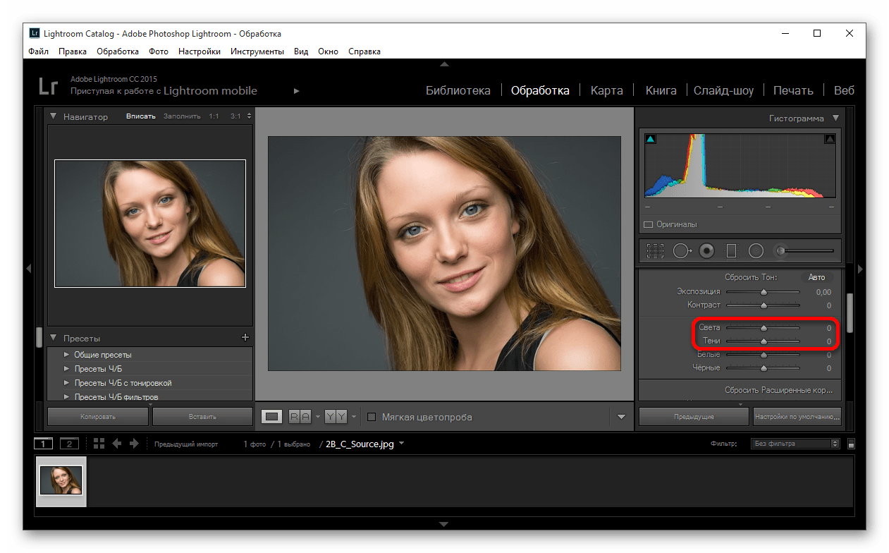 Оцените изображение: нуждается ли оно в увеличении или уменьшении света, тени. Если да, то в разделе «Основное»