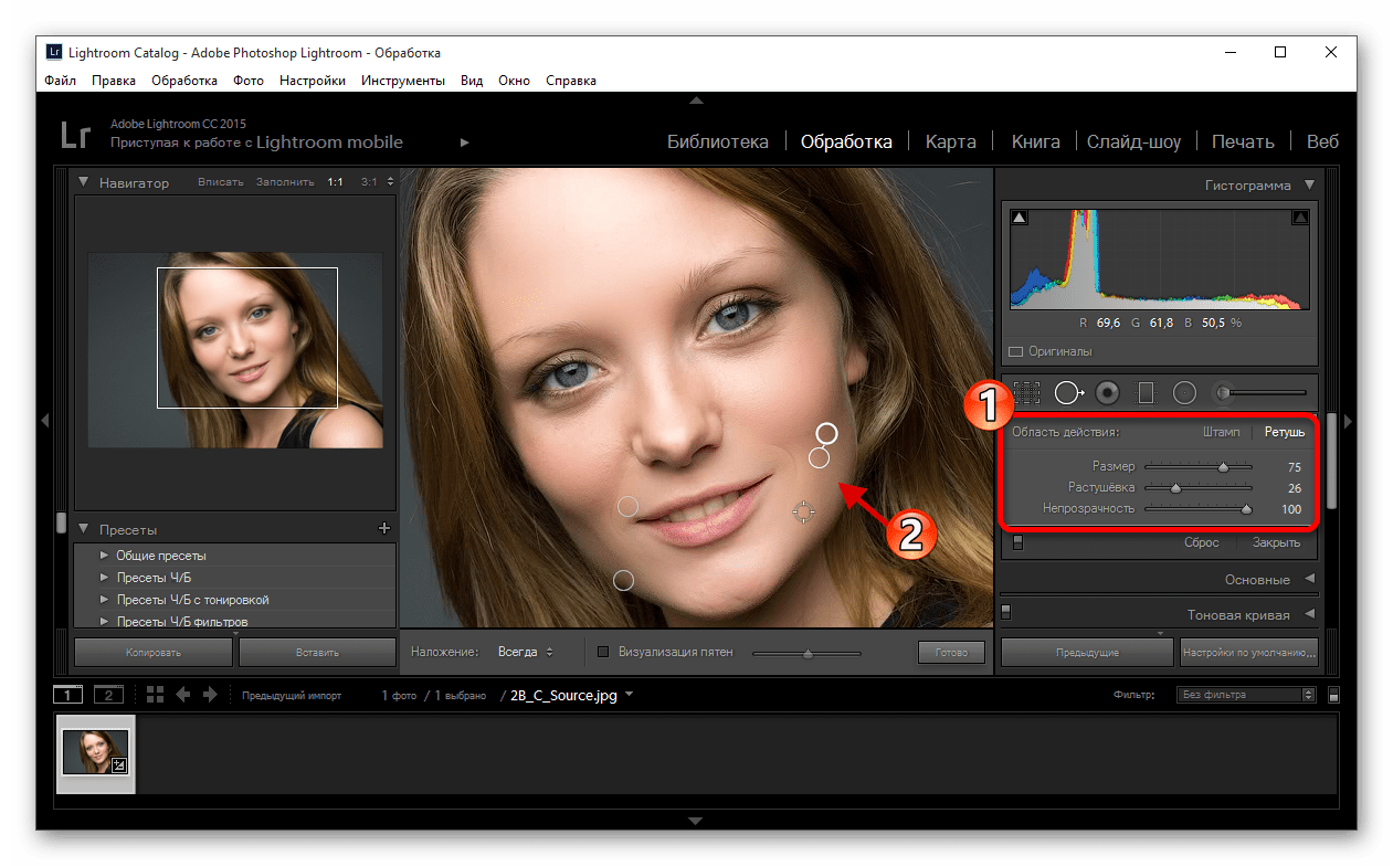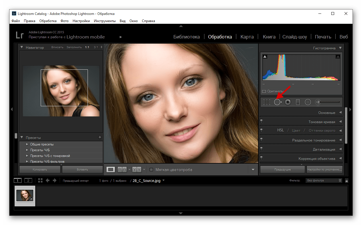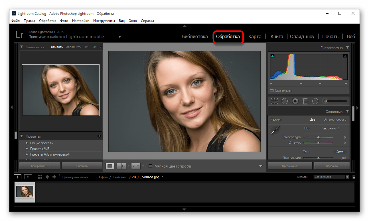 - Запустите Lightroom и выберите фотопортрет, который требует ретуши.