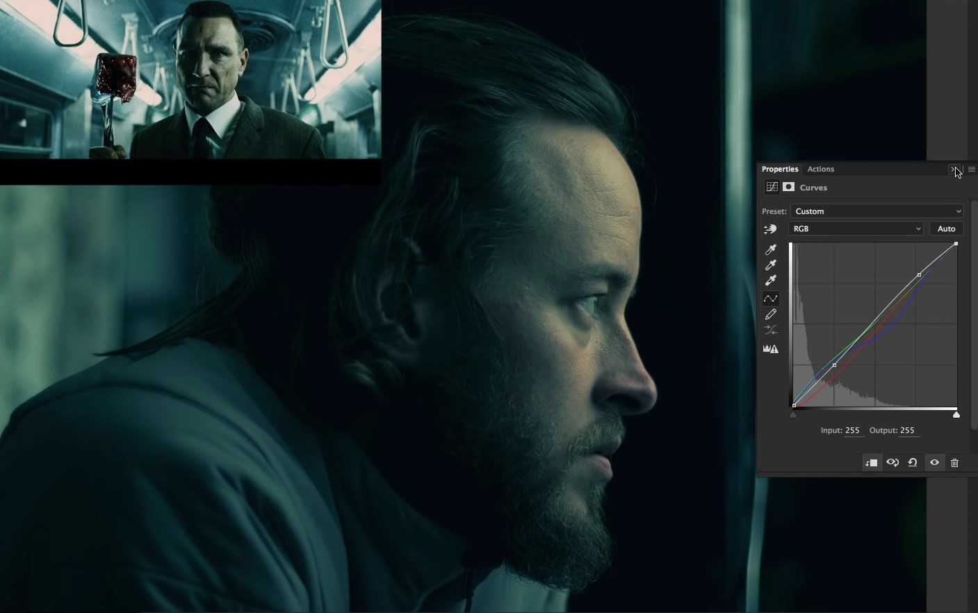 С помощью кривых немного тонирую наше изображение. Захожу поочередно в синий и красный канал, затем произвожу корректировку в мастер кривой (RGB).