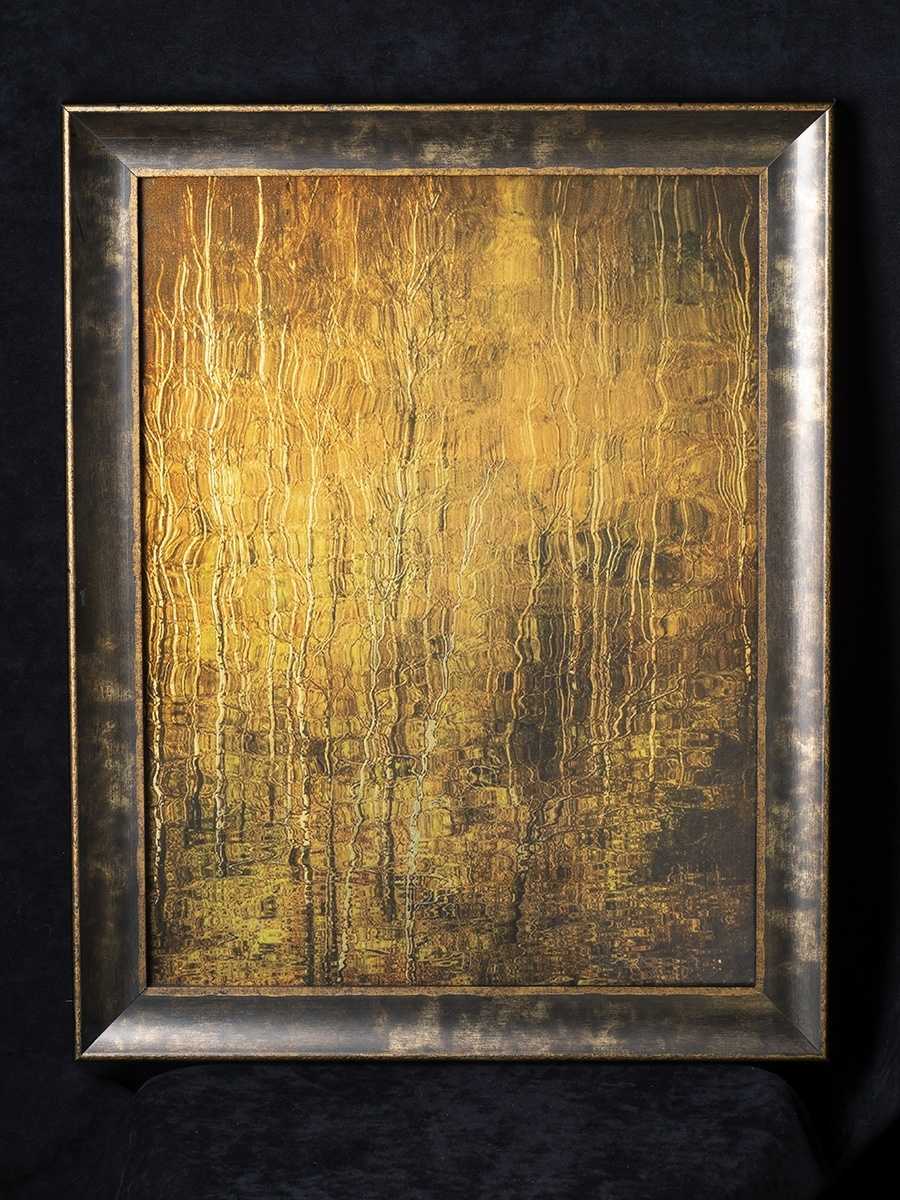 Техника эгломизе. На зеркало кладется тонкий лист золота, после чего делается гравировка и покрывается краской. Очень муторный и дорогой процесс, но выглядит потрясающе. Мы немного усовершенствовали этот процесс: разбираем старое зеркало, снимаем с него все слои до амальгамы, чистим и потом на поверхность печатаем изображение и закрываем поталью. Протравленная поталь дает ажурный узор.