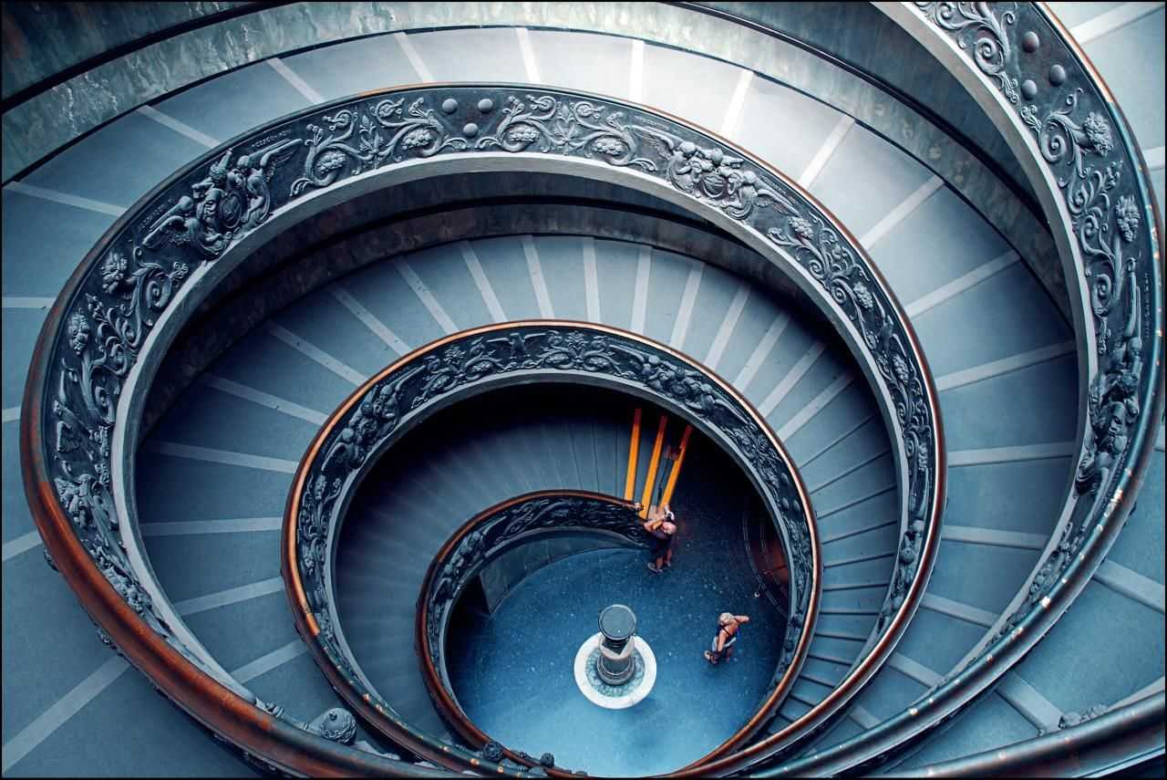 Отличный пример этой перспективы — это фотография винтовой лестницы. Если представить, что по центру кадра проходит ось, то спускаясь по ней, каждый виток лестницы будет становиться всё меньше, пока не превратится в точку.