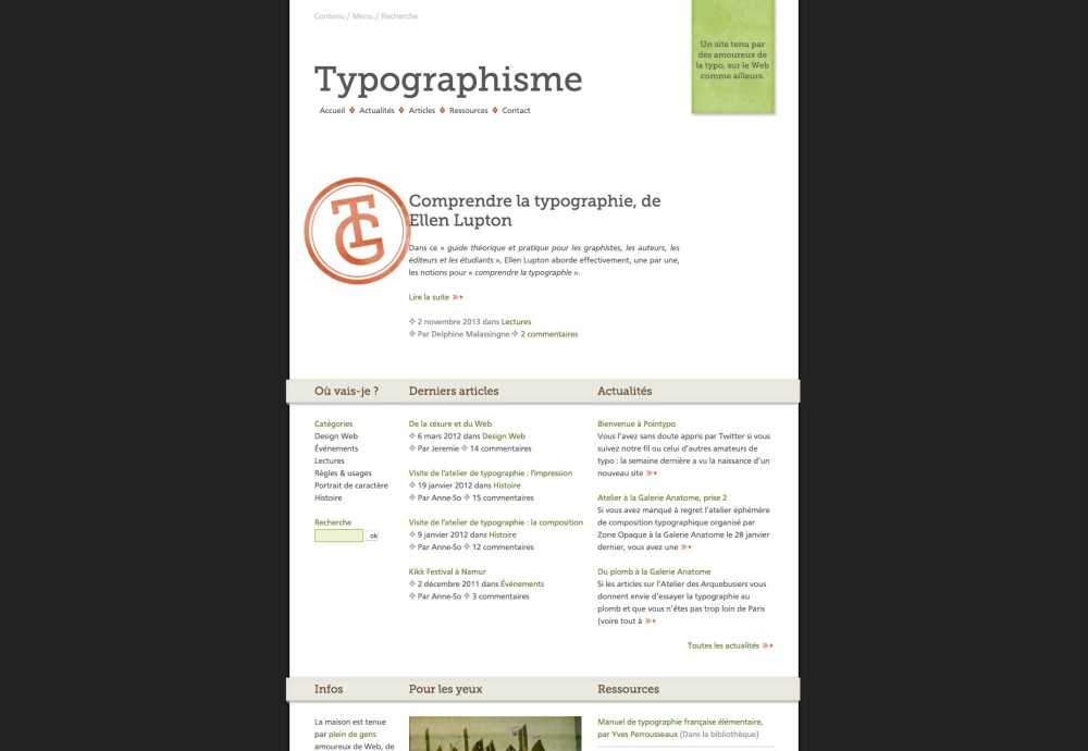 Typographisme – прекрасный вариант асимметрии в веб-дизайне. Эмблема TG и зеленая печать верхнем углу создают асимметрию.