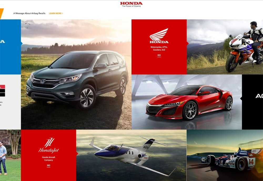 Honda дает нам отличный пример асимметрии в веб-дизайне. Ниже картинки на домашней странице компания использует сеточный дизайн, что приводит к несколько неорганизованному виду, который создает видимость отсутствия равенства по обе стороны от вертикальной или горизонтальной центральной оси.