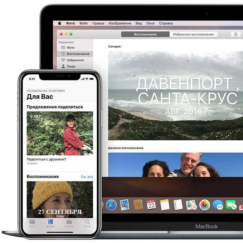 У Apple очень комфортный и интеллектуальный поиск по фото. Программа умеет искать события, даты и людей на фотографиях, используя геоданные и время съемки, а также распознавание лиц. В программе Фото есть уникальная вкладка Воспоминания, на которой программа сама составляет вам подборки фотографий при помощи интеллектуальных алгоритмов — просто откройте ее и программа поможет вам вспомнить свадьбу сына или поездку на Алтай в августе 2016.