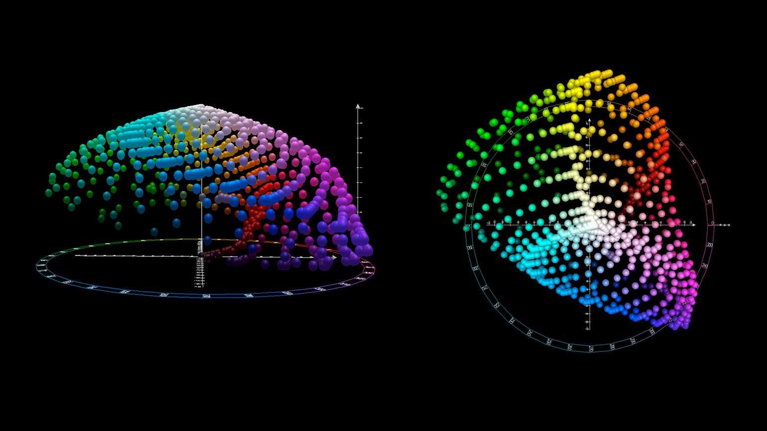 Также было важно, чтобы изменение значений координат было нелинейным и приводило к изменению цвета по логике, близкой к осознанию цвета человеком.. Трёхмерная визуализация пространства LAB: фронтальный вид и вид сверху
