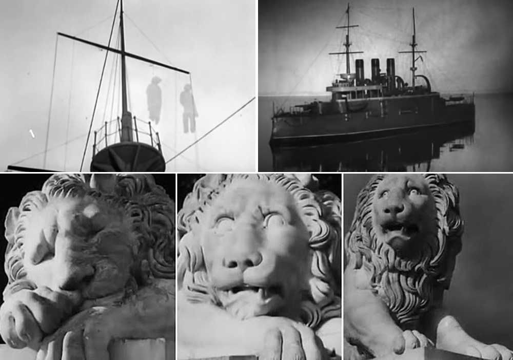 Пример драматичного монтажа — сцена с изображением трёх каменных львов у ограды дворца – спящего, пробуждающегося и поднявшегося на задние лапы –лев словно оживает.