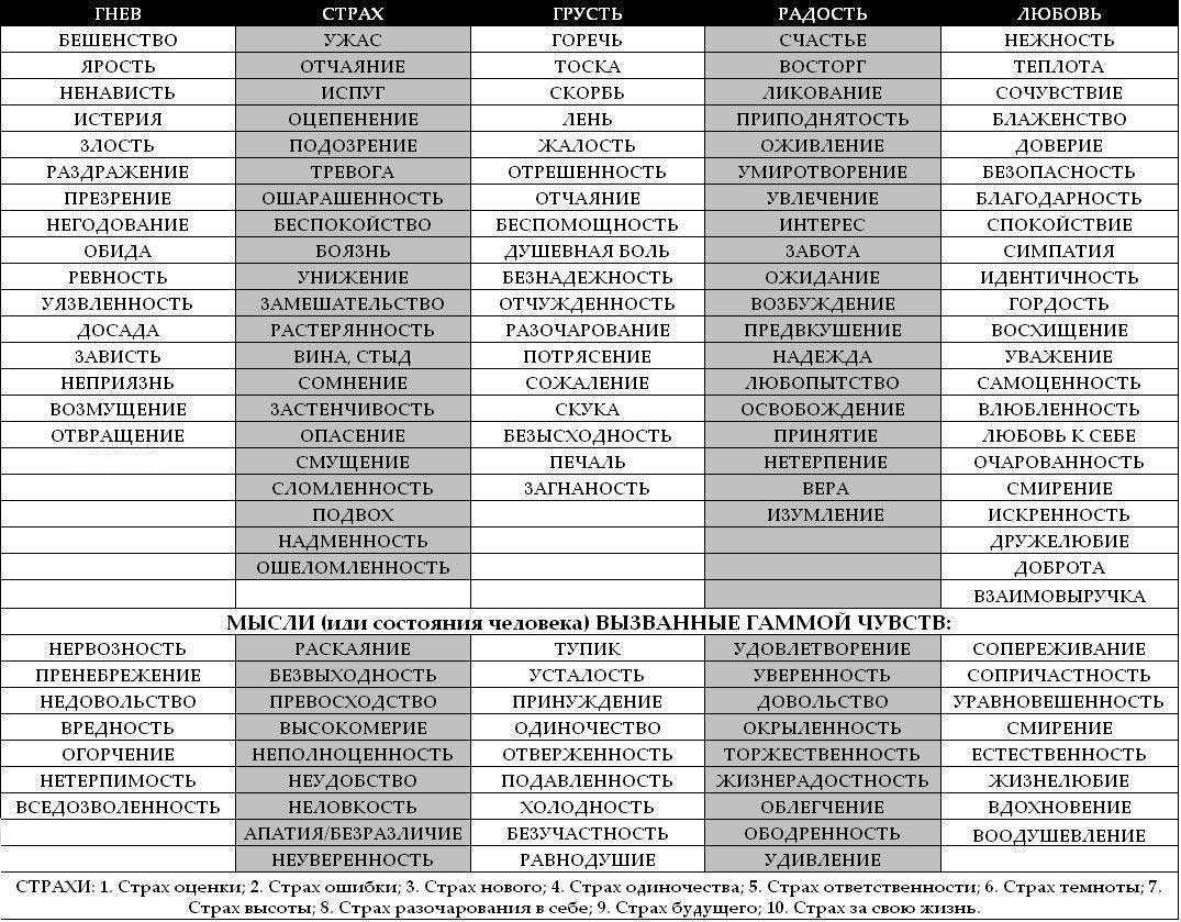 Давайте более подробно рассмотрим каждое состояние отдельно, чтобы понять всю глубину эмоционального состояния человека. Но, для начала ознакомьтесь с таблицей эмоций человека.