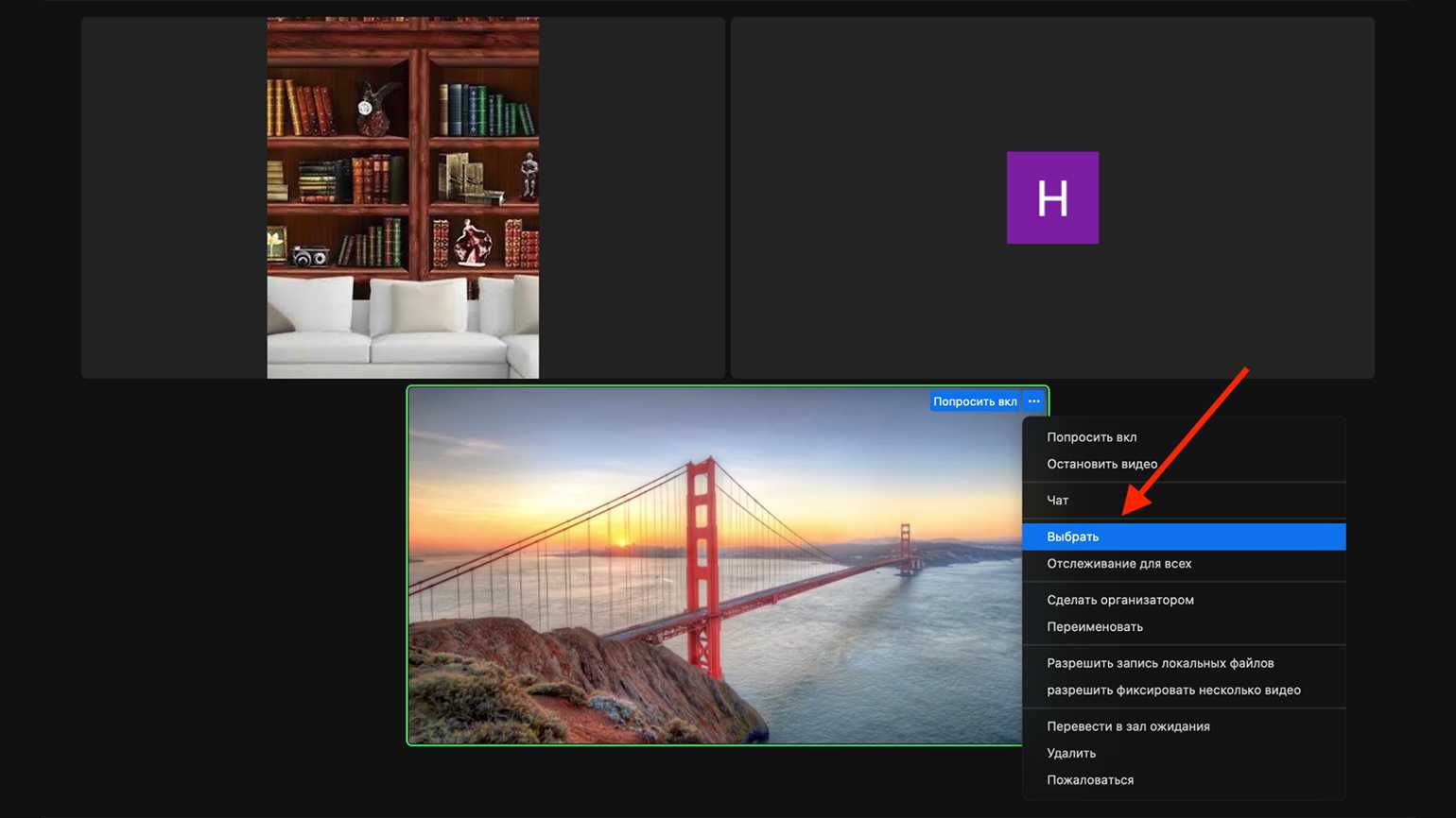 Если участников в вашей конференции довольно много, а вы хотите видеть у себя на экране конкретных участников, можно воспользоваться функцией закрепления. Она работает только локально, то есть вы закрепляете видео для себя, для всех остальных пользователей ничего не изменится. Закреплённое видео займёт центр экрана, что может быть полезно, если вы, скажем, хотите во время онлайн-урока следить, насколько вовлечён в занятие конкретный ученик. Всего можно закрепить до девяти видео.