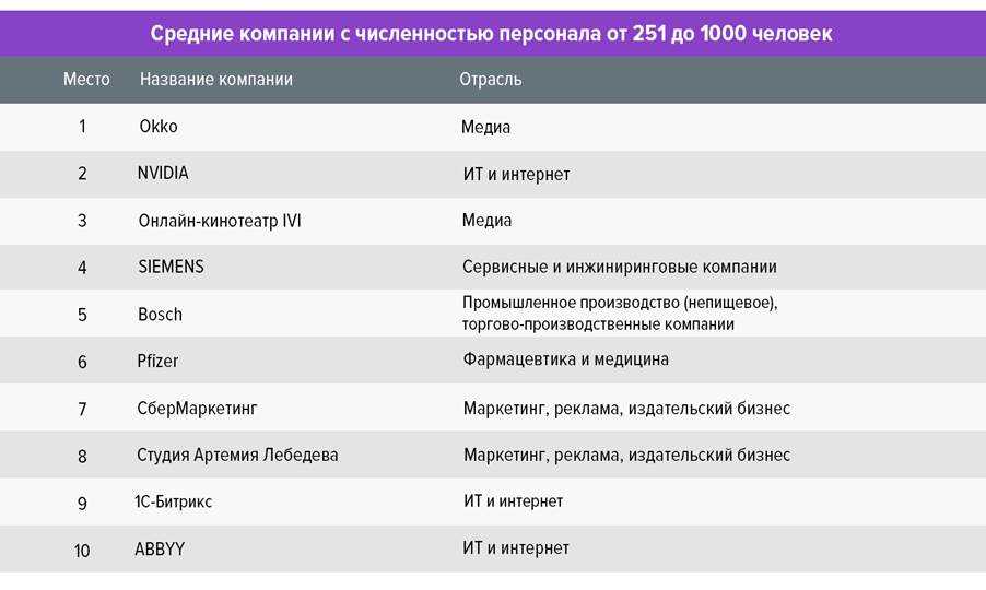В целом можно отметить успехи компаний из отрасли медиа, в частности — онлайн-кинотеатров: Okko на первом месте, IVI — на втором. Опять же, прослеживается прямая взаимосвязь между ростом популярности и востребованности сферы и развитием HR-процессов в ней. В COVID-реалиях в обществе продолжает расти спрос на всё, что связано с онлайном, а в подобных компаниях, следовательно, увеличивается потребность в людях и в том, как их развивать и поддерживать. NVIDIA второй год удерживается на второй строчке Рейтинга — стабильность компании в самое нестабильное на рынке труда время.