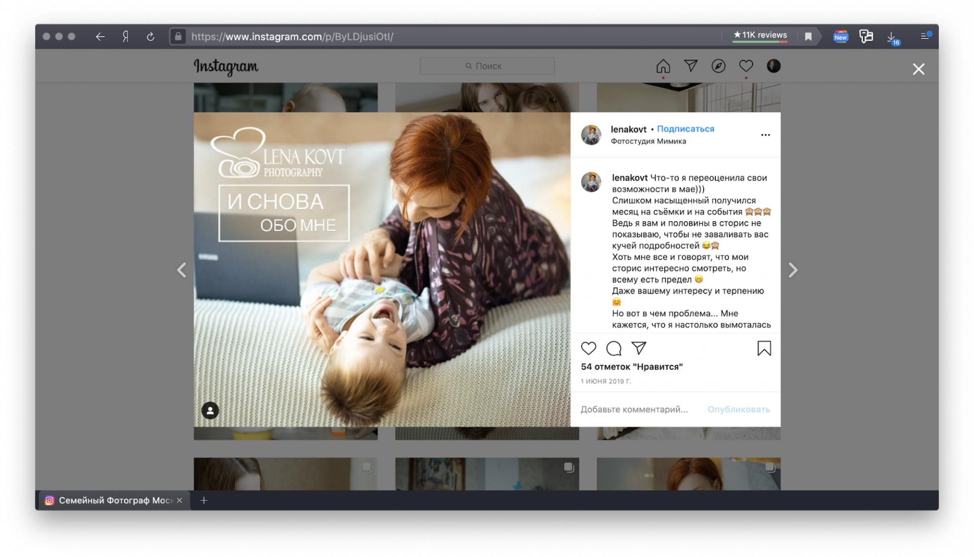 Я специально веду инстаграм и рассказываю о себе, чтобы мои будущие клиенты могли понять, подхожу я им или нет. Клиенту должно быть легко с фотографом во время съемки, будто они уже давно знакомы, тогда снимки получаются живыми. Благодаря инстаграму у моих клиентов даже при первой съемке есть чувство, что мы хорошо друг друга знаем, и это помогает в работе