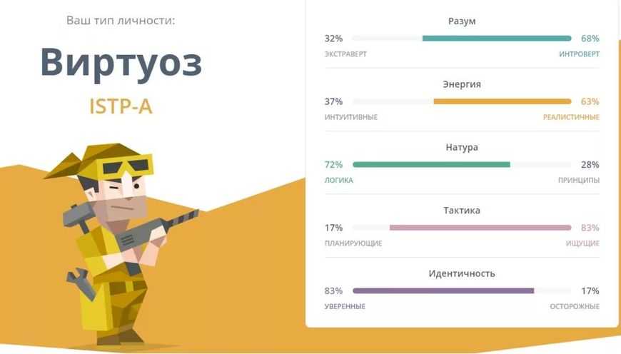 Вместо теории «Виртуозы» предпочитают практику, ошибки и опыт. Это помогает им в полной мере убедиться в том или ином аспекте любого дела. Они хотят доверять себе на 100%, что и объясняет их стремление испытать все на себе.