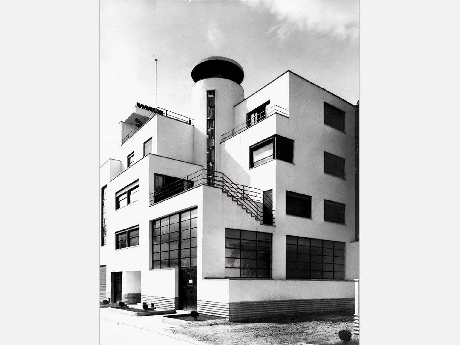Дом Малле-Стивенса. Некоторые элементы напоминают облик океанских лайнеров. В двадцатые и особенно в тридцатые годы, архитекторы вдохновлялись их эстетикой. В доме Малле-Стивенса это заметно по круглому окну-иллюминатору и закруглённому углу террасы, напоминающему палубу. На первом этаже находилось агентство архитектора.