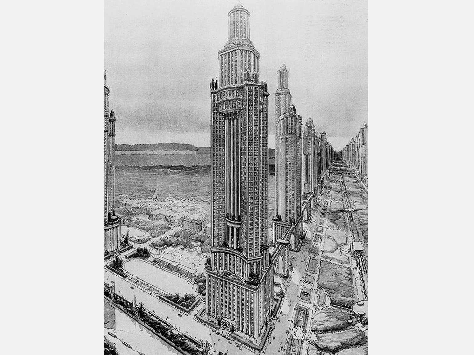 Проект Огюста Перре «Город башен». 1922 год. В квадратных основаниях должны были располагаться торговые помещения и офисы. Изображение: Жак Ламбер по эскизам Огюста Перре, 1922 г. / Библиотека Конгресса США