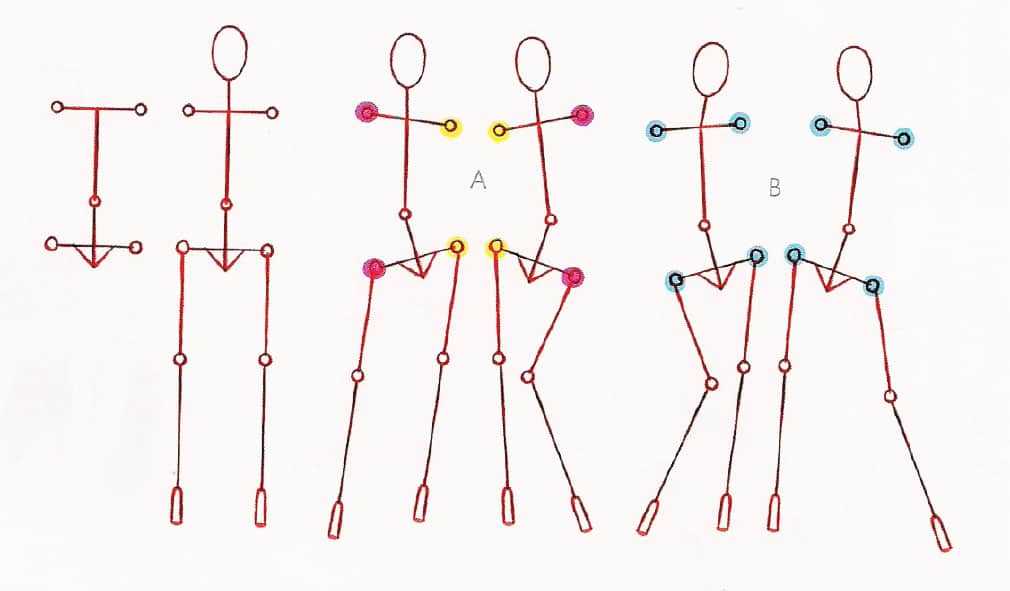 В зависимости от движения тела линия плеч и линия бедер могут быть параллельны, как показано на рисунке B, но старайтесь не использовать такую позу, если она не выглядит естественно.