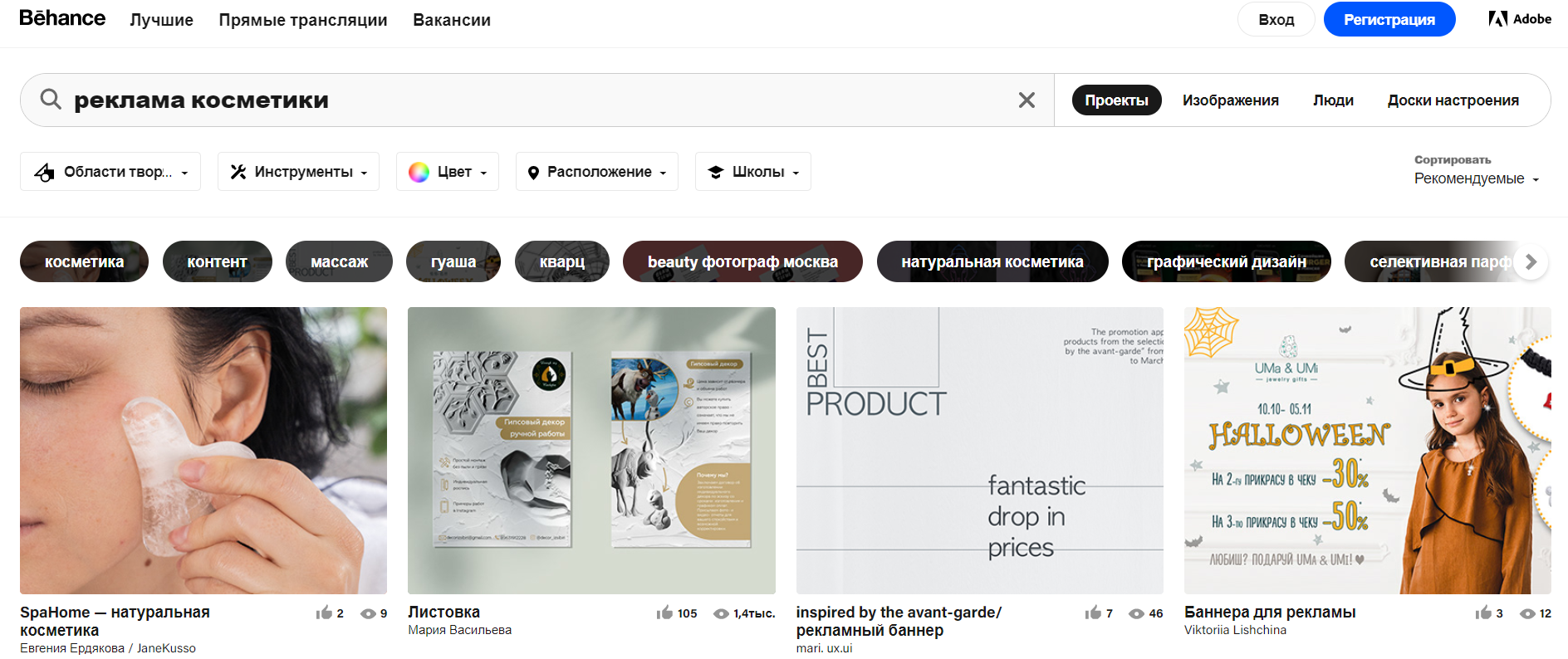 Можно использовать дополнительные фильтры для поиска нужного контента, например, по цвету, по продукту Adobe, с помощью которого создавался визуал, по области творчества (иллюстрация, графический дизайн и другие), по камере, если речь о фото и т. д.