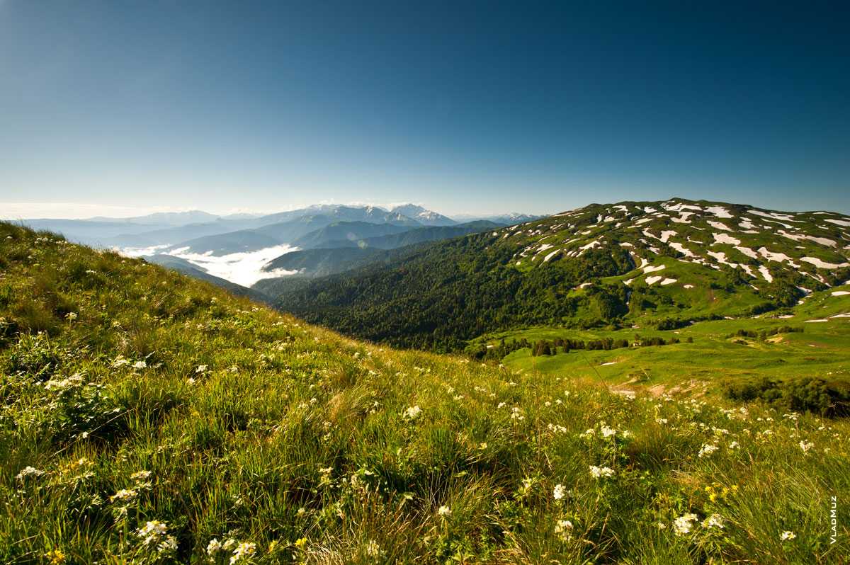 Луговые цветы, травянистые склоны на переднем плане, вдали — ряды горных хребтов Кавказа