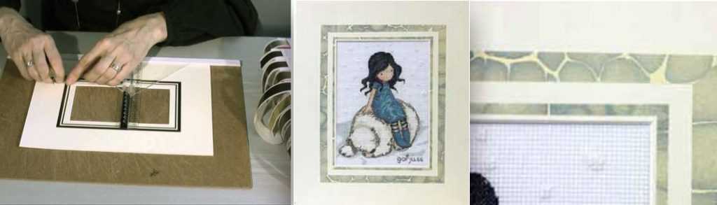 На фото слева — наклейка ленты, две правые фотографии — украшение passe partout лентой. Проект А. Пожарского.