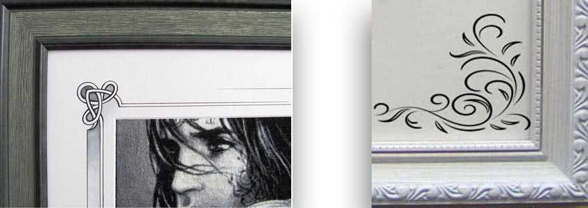 Слева узор, прорезанный вручную багетным мастером О. Араповым в нашей мастерской,а справа паспарту , вырезанное на компьютерном станке.