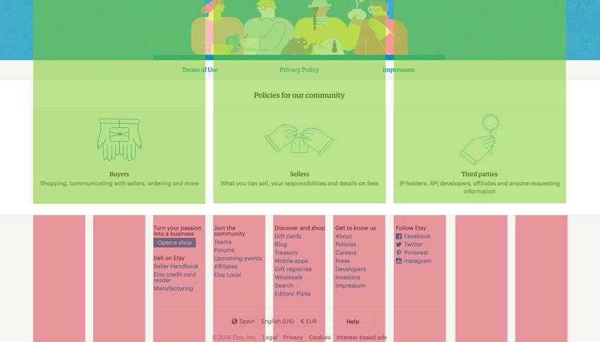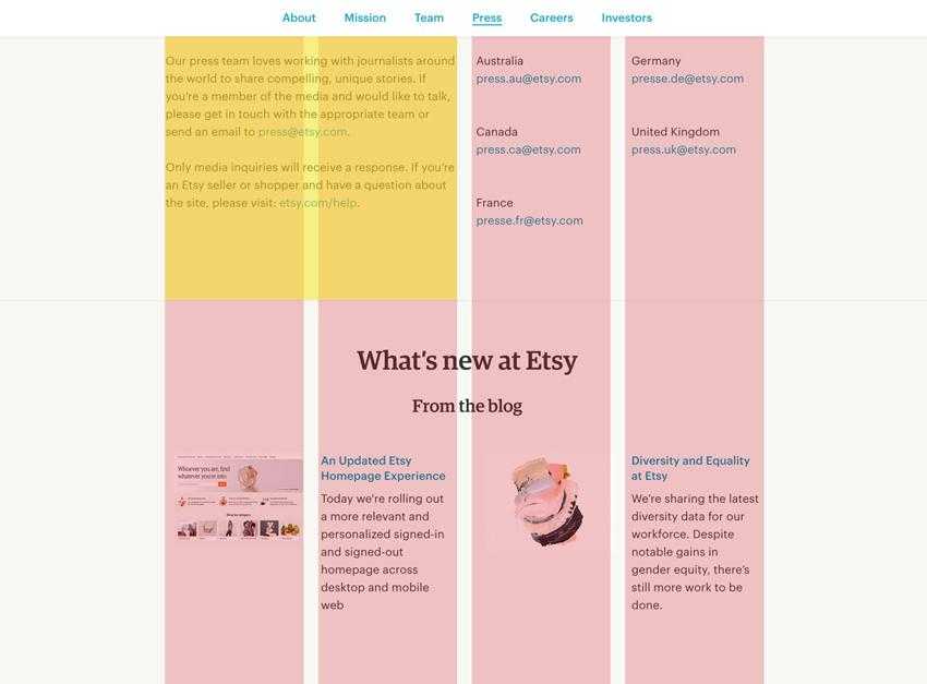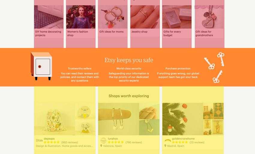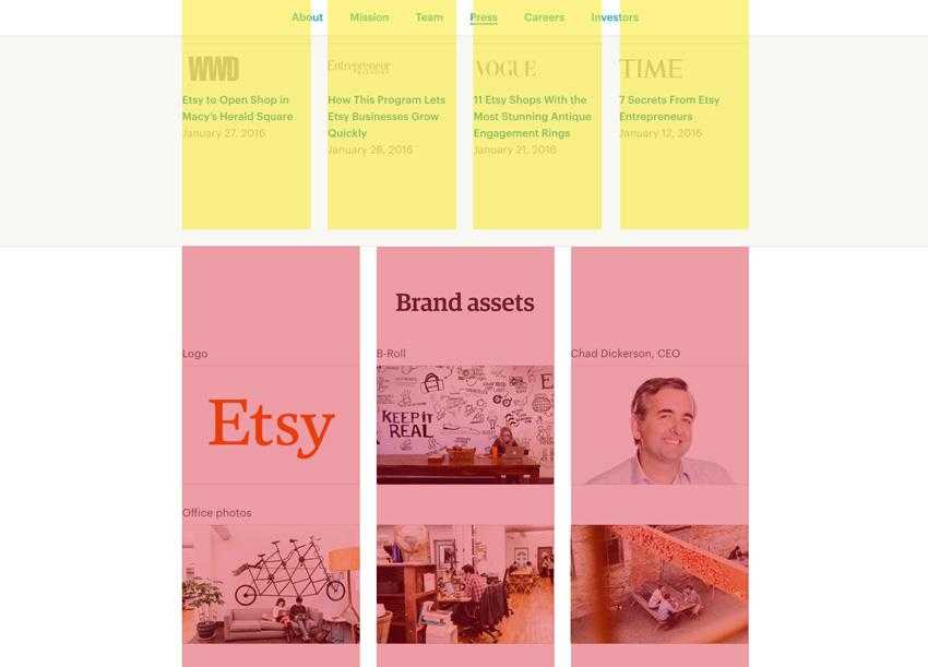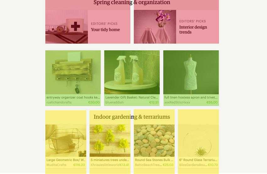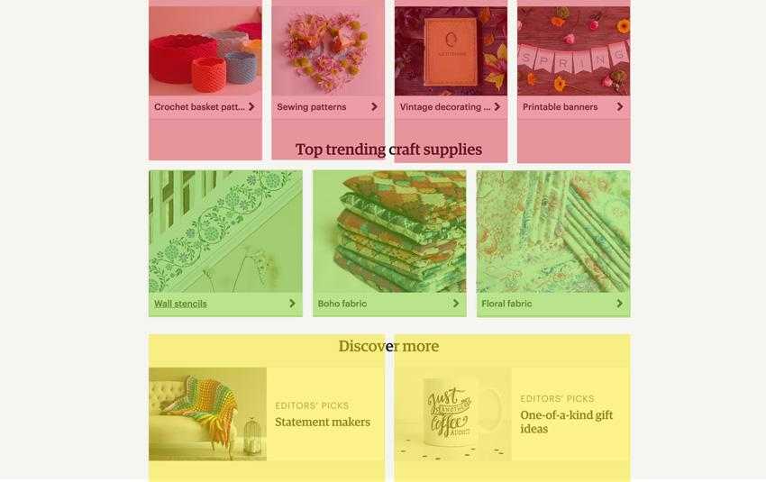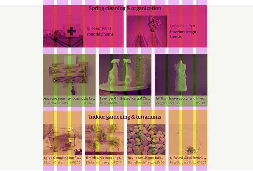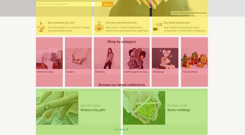 Давайте посмотрим на несколько примеров того, как Etsy успешно решает этот вопрос. Только на этот раз, давайте сосредоточимся на том, как их сетки поддерживают различные потребности контента, и как они миксуют их от одной страницы к другой. По-моему, они проделали большую работу по поддержанию последовательности, которая создает единое впечатление, аккуратно связывая страницы вместе. Таким образом они ведут пользователя по контенту, и он знает, чего ожидать. Их ментальная карта не имеет каких-либо сюрпризов, которые могут испортить взаимодействие пользователей с сайтом.