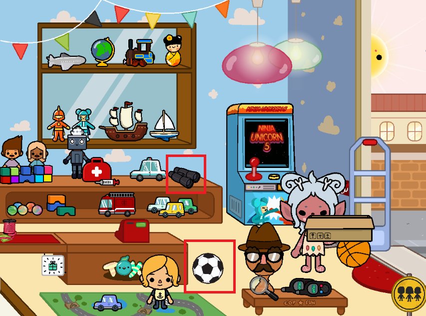 В магазине игрушек вам нужно найти мячик и бинокль.