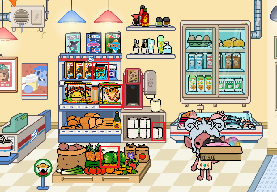 В продуктовом магазине забираем с собой пиццу, капусту, туалетную бумагу и упаковку Potato.
