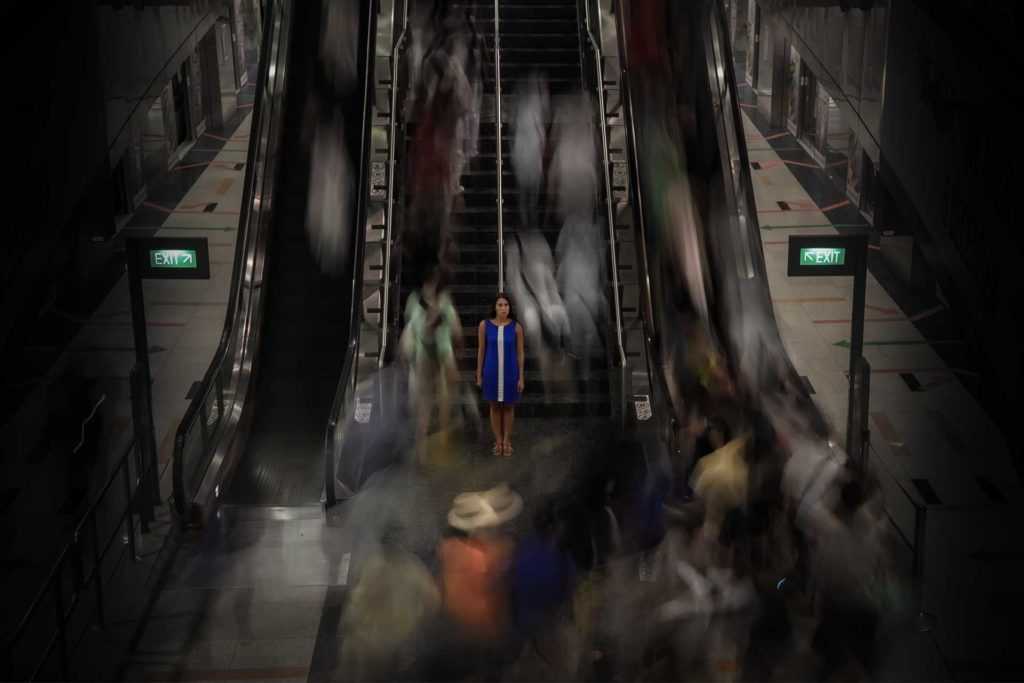 2”, f/4, ISO 100, ФР 58мм. Я попросил ассистентку замереть на две секунды, когда группа людей, вышедшая из поезда метро, проходила мимо. Александр Ипполитов
