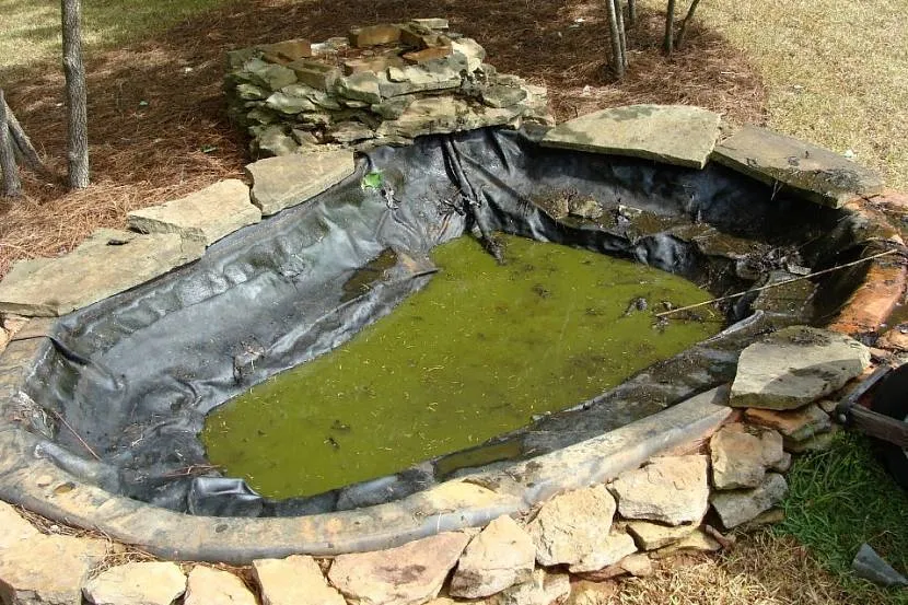 Захлёст гидроизоляционного слоя нужен, чтобы предупредить его сползание под воздействием массы воды. По краям гидроизоляционный слой закрепляют с помощью камней. Присыпают песком и щебнем. Устанавливают горшки с влаголюбивыми растениями.