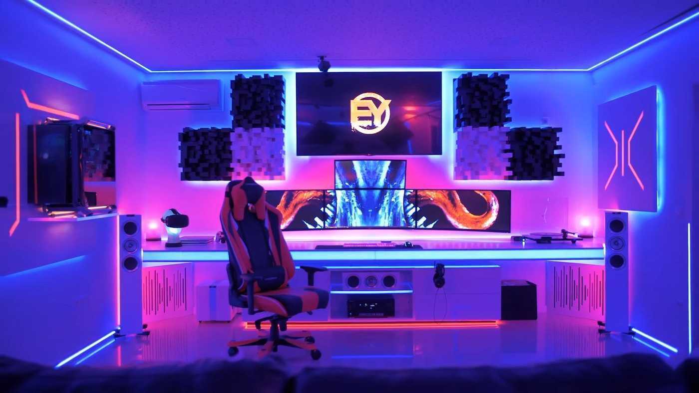 Так как самый популярный стиль интерьера геймерской – это хай тек, то и свету зачастую уделяется особое внимание, особенно светодиодной неоновой подсветке, которая характерна для стиля. Разрабатывается проект не только общего освещения, но и точечной подсветки отдельных предметов или участков комнаты