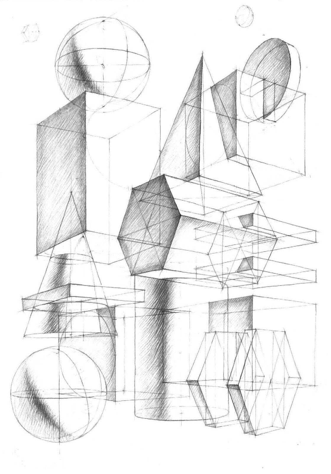 Композиция из геометрических тел. Линейный рисунок без тона. Основные элементы строим напросвет( так, как будто они из стекла) Стараемся пока использовать только кубы или прямоугольные параллелепипеды.