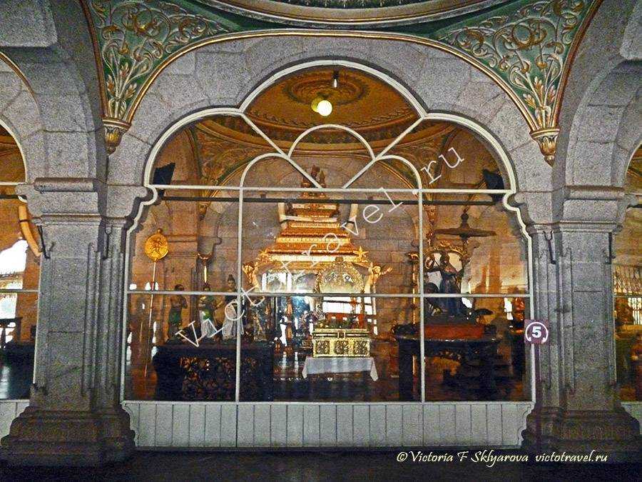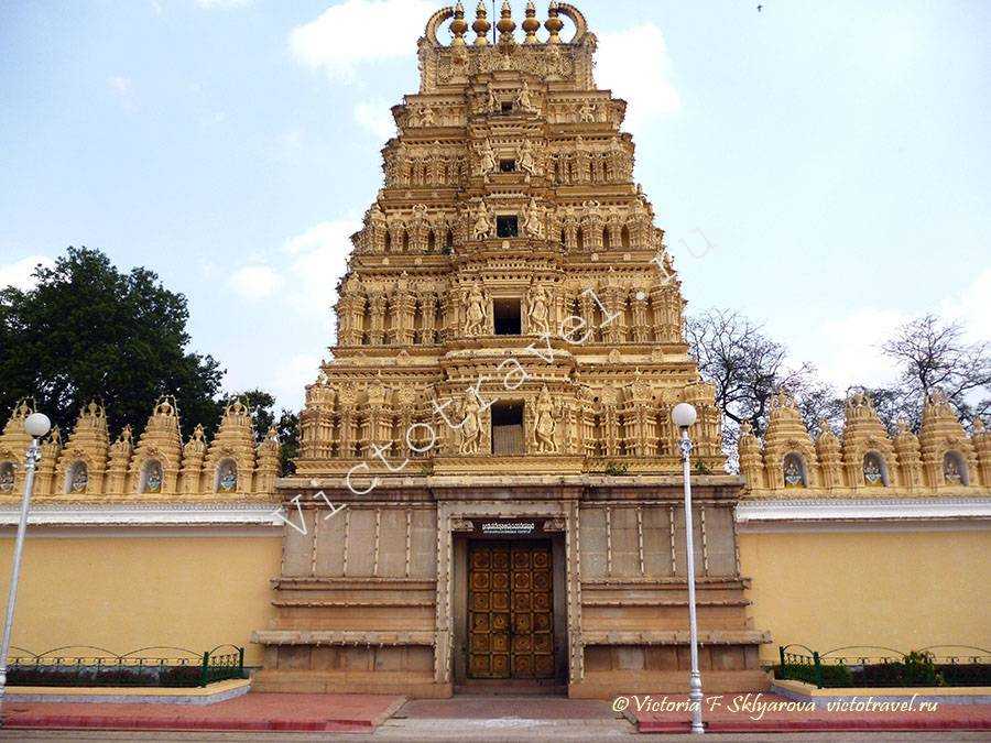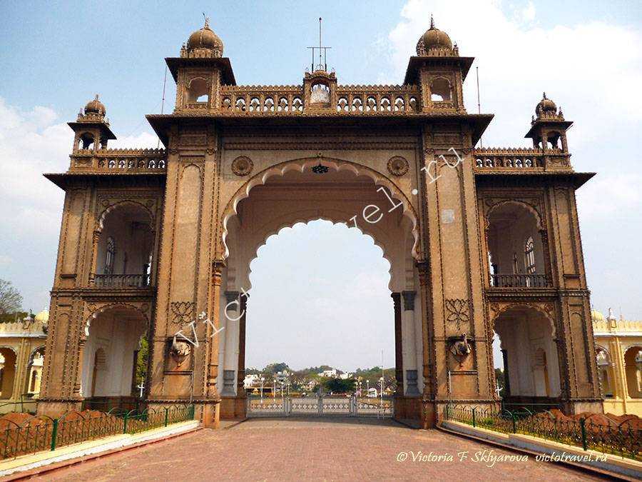 Самый первый дворец, однако был построен здесь в 14 веке, но он несколько раз разрушался, достраивался и перестаивался. Во майсурском дворце располагалась резиденция правящей династии Ванаров. Сейчас там интересный музей, а на огромной территории находится несколько храмов (7 или 12 точно не помню) и три или четыре входа (gates), украшенных красивыми воротами арками, но войти можно было только в один, а выйти в другой. По воскресеньям и праздникам вечером с 19 до 20 ч весь дворец освещается и сверкает многочисленными лампочками, которых 5000 штук. (фото нет)