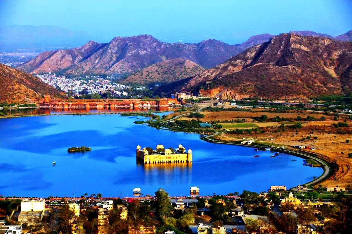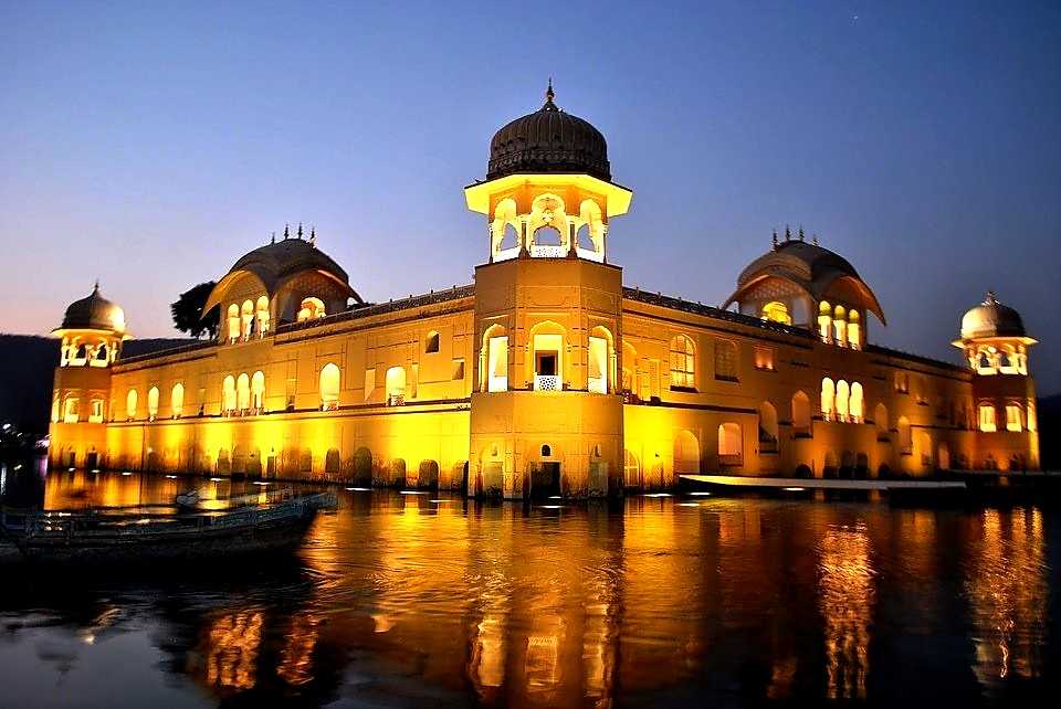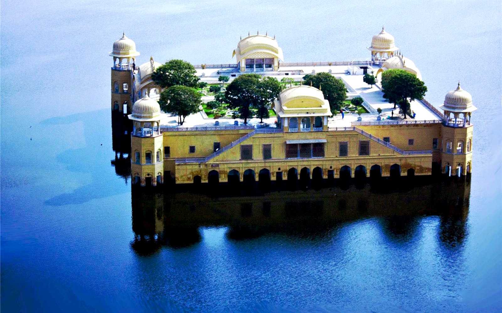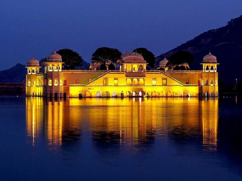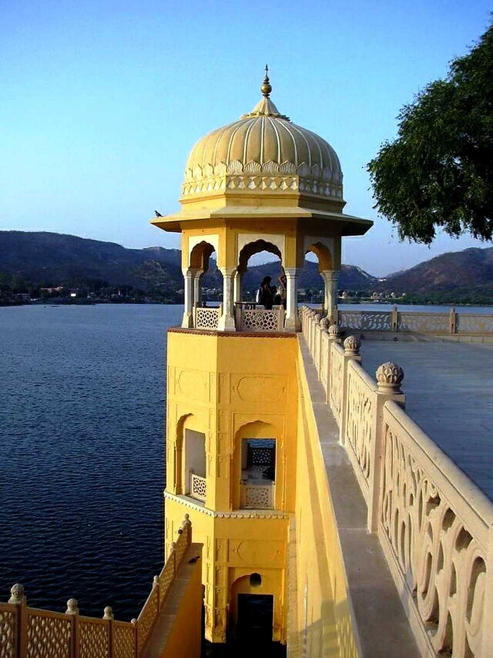 Дворец Джал-Махал (Дворец на воде) стоит прямо посреди небольшого озера Ман Сагар в нескольких километрах от города Джайпура. Дворец был возведен в индо-мусульманском стиле Мадхо для правителя Раджастана Сингха I в середине XVIII в. и служил в качестве охотничьего загородного дворца.