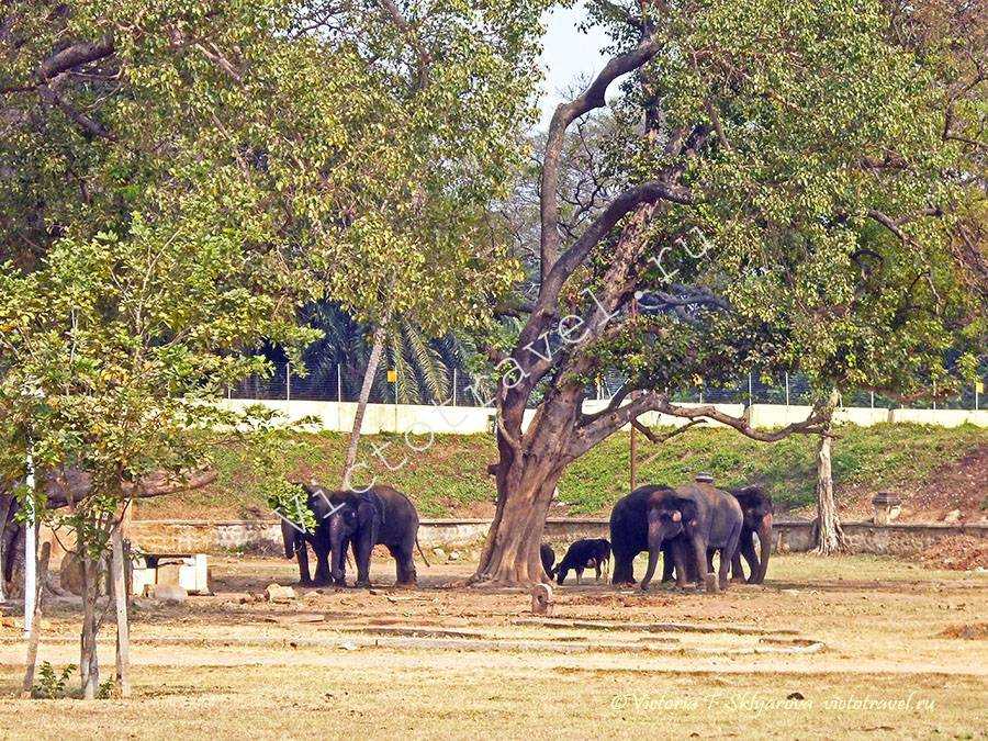 Огромный двор форта Дворца Махараджи я обошла почти весь — уж очень впечатляюще. В стороне увидела дворцовых слонов, но близко подойти не решилась. Их, скорее всего, используют для праздничных церемоний. Слоны стояли в тени дерева, прячась от солнца.