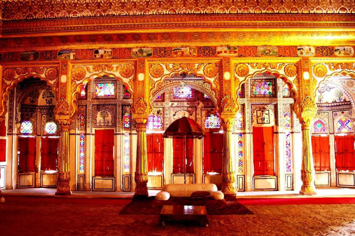 В здании Мубарак-Махал, украшением которого служат грандиозные «Слоновые ворота» с уникальной резьбой по мрамору, находится музей тканей, костюмов и музыкальных инструментов. В зале Силех Кхана выставлена коллекция церемониального оружия из золотого, инструктированного бриллиантами. В зале аудиенций представлены портреты (фотографии и старинные полотна) первых лиц Раджастана, наших современников и махараджей, а так же фотографии именитых гостей и фоторепортажи приемов этих гостей. Во дворце собрана лучшая библиотека древних манускриптов и рукописей.