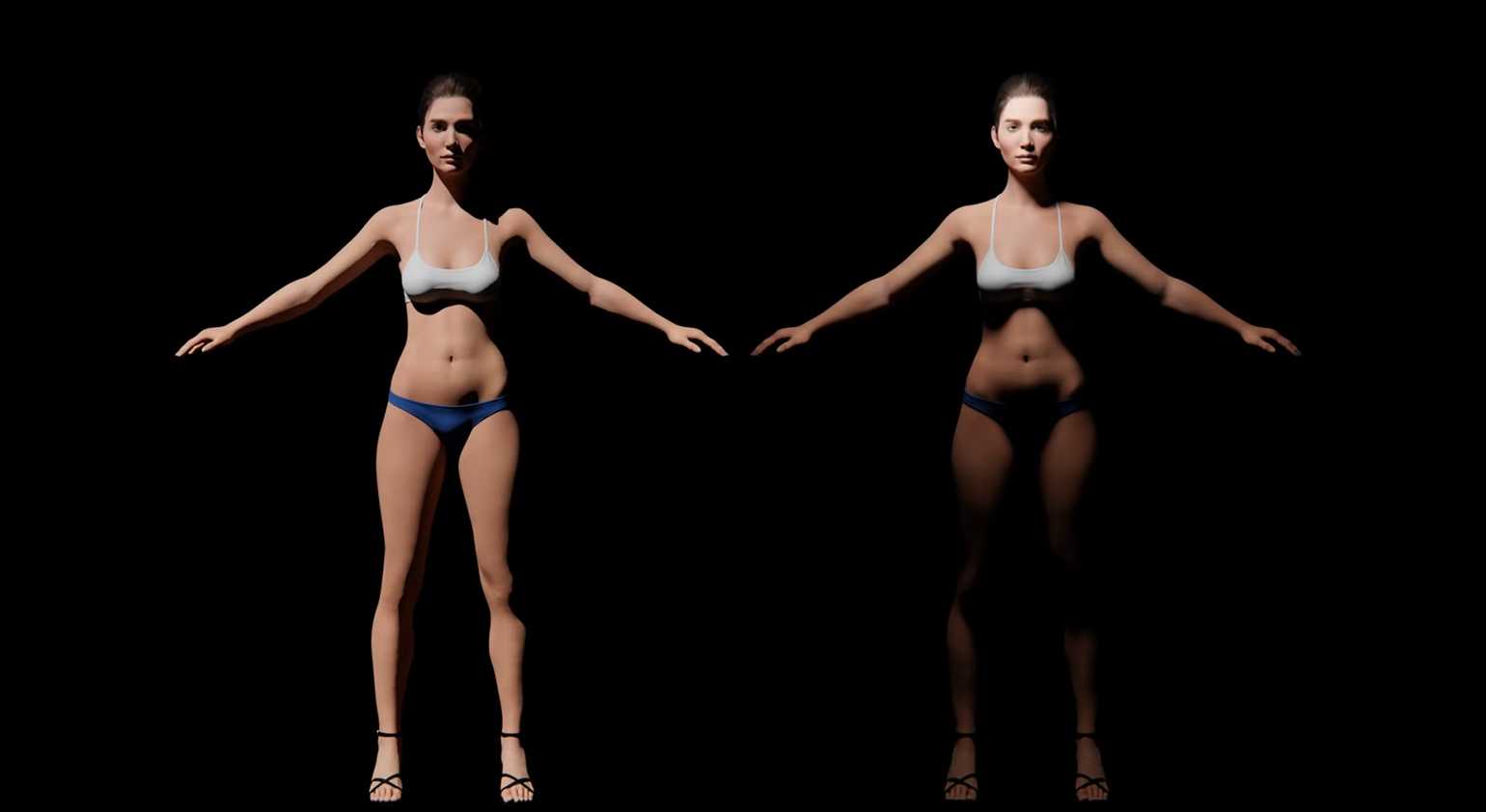 На первом изображении источник света расположен в верхнем левом углу на расстоянии 120 метров от объекта и охватывает всё тело. Если переместить свет ближе к голове модели, её лицо станет центром композиции, а нижняя часть туловища скроется в тени. При этом размер и мощность источника освещения остались прежними.