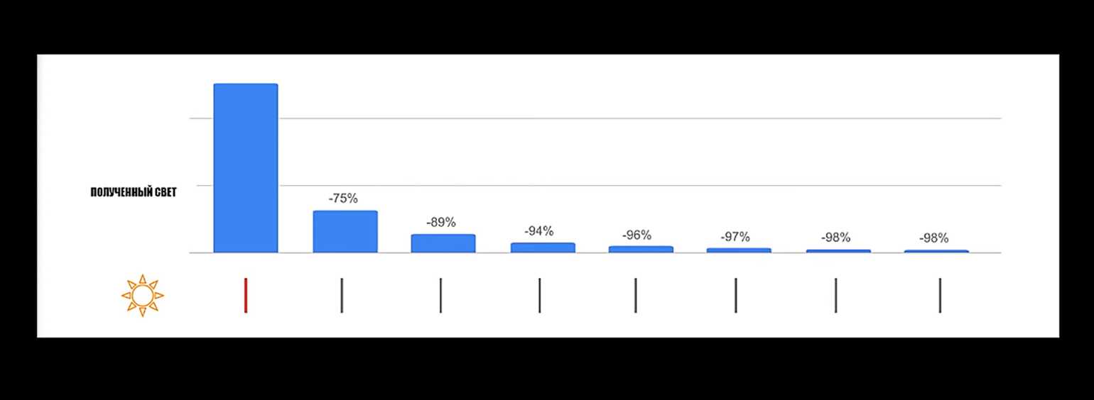 Диаграмма выше показывает, что на расстоянии между позициями 7 и 8 количество света одинаково (98%), тогда как разрыв между первой и второй точкой составляет 75%, несмотря на то, что дистанция одинаковая. Из этого следует, что чем дальше источник расположен от объекта, тем меньше интенсивность лучей, и с расстоянием она снижается медленнее. Вот почему, когда мы смотрим на высокое здание в безоблачную погоду, мы видим, что его верхняя часть — наиболее близкая к солнцу — засвечена, а нижняя освещена почти равномерно.