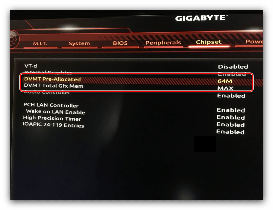 В разделе «Chipset» можно либо полностью отключить встроенную графику для снижения нагрузки на CPU (опция «Internal Graphics» в положении «Disabled»), либо увеличить или уменьшить объём оперативной памяти, которая потребляется этим компонентом (опции «DVMT Pre-Allocated» и «DVMT Total Gfx Mem»)